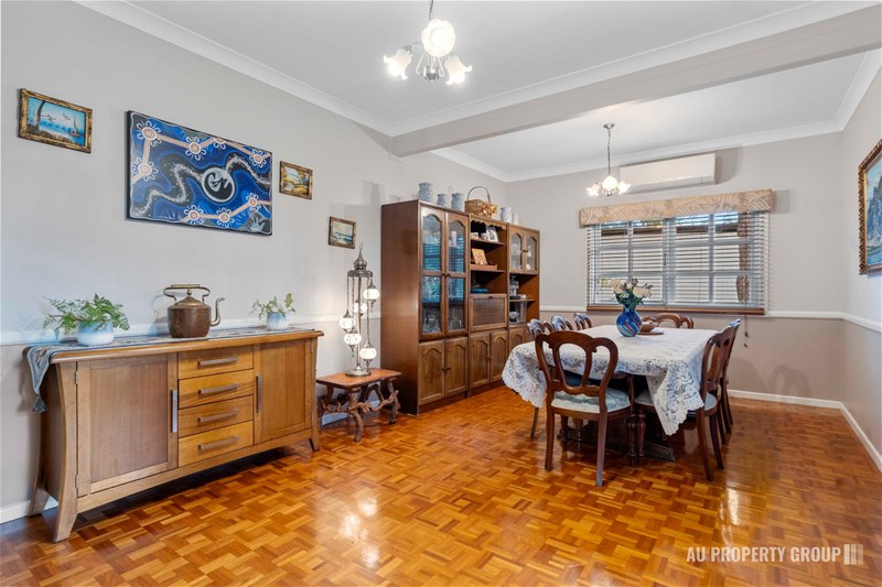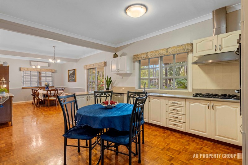 The family/dining room creates a warm and inviting space for shared meals and dinner soirees, seamlessly connected to a spacious modern kitchen with a stainless steel gas cooktop, dual oven, dishwasher, and stone bench tops. ?????