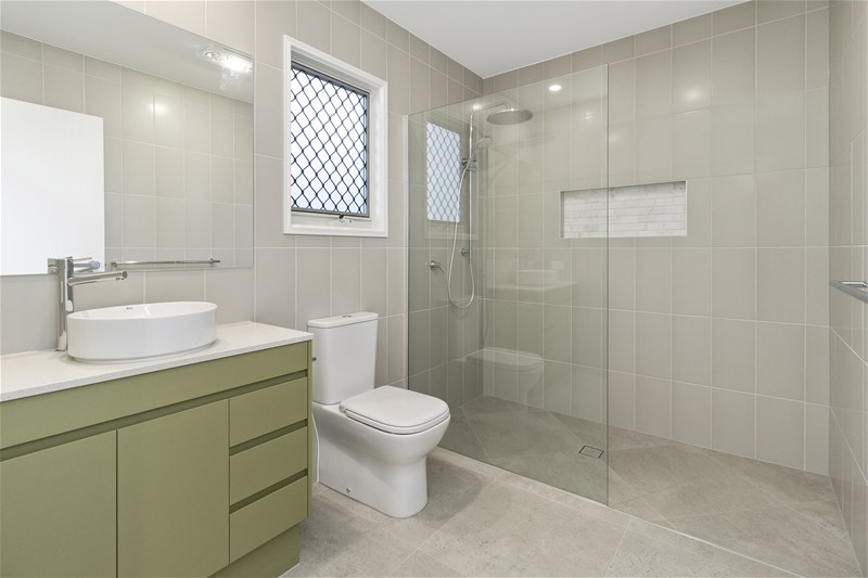 20mm engineered stone benchtops in kitchen, bathrooms, and laundry.